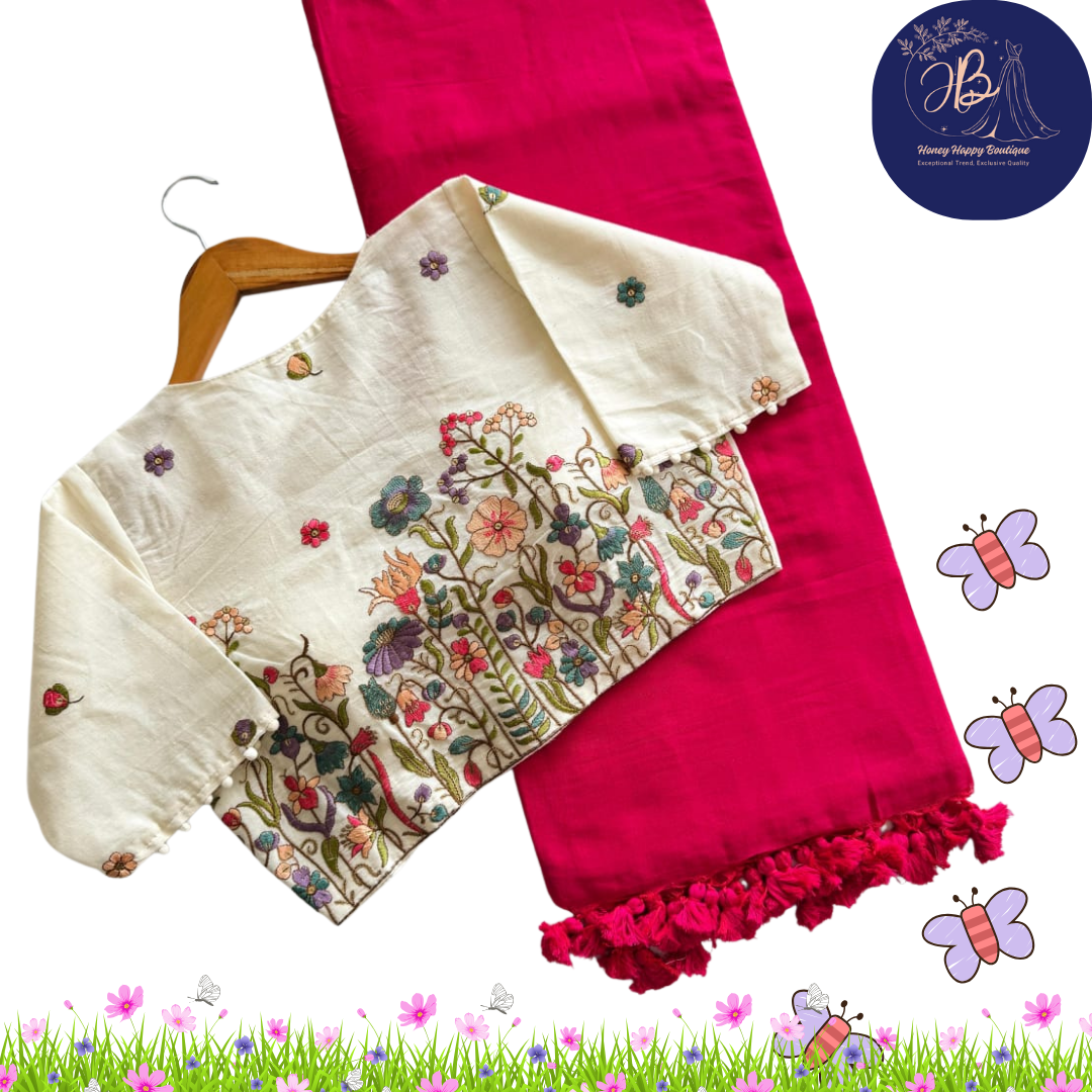 The saree comes with a pure Khadi dyeable blouse featuring beautiful 🪡 chain stitch & embroidery work on the back and throughout – crafted to enhance your ethnic glow. The padded, front-open blouse ensures comfort and ease of wear, while the ✨ pompom-detailed sleeves add a fun and stylish twist!